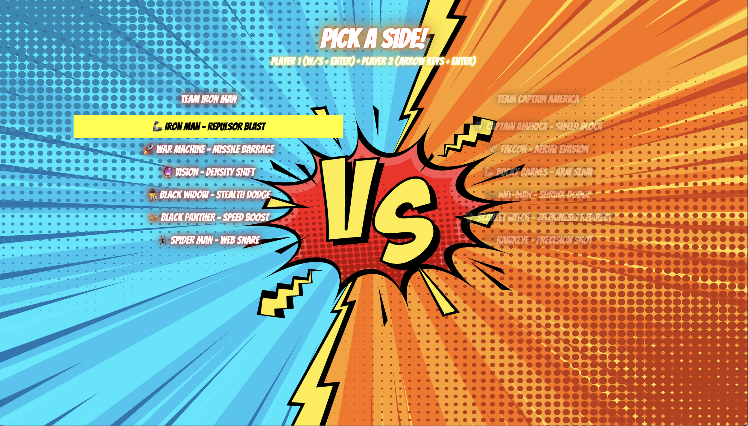 Marvel Civil War Pong is a custom-coded browser game I created using JavaScript and p5.js. Inspired by classic Pong and Marvel’s Civil War, players can choose from different heroes—each with their own abilities—and compete on themed battlegrounds. The game features original screens, background transitions, hero icons, and interactive gameplay.