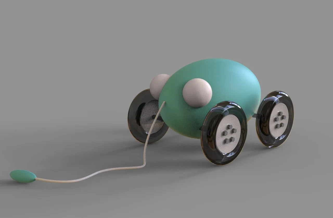 Pull Toy: A nostalgic design combining wood textures with whimsical button wheels.